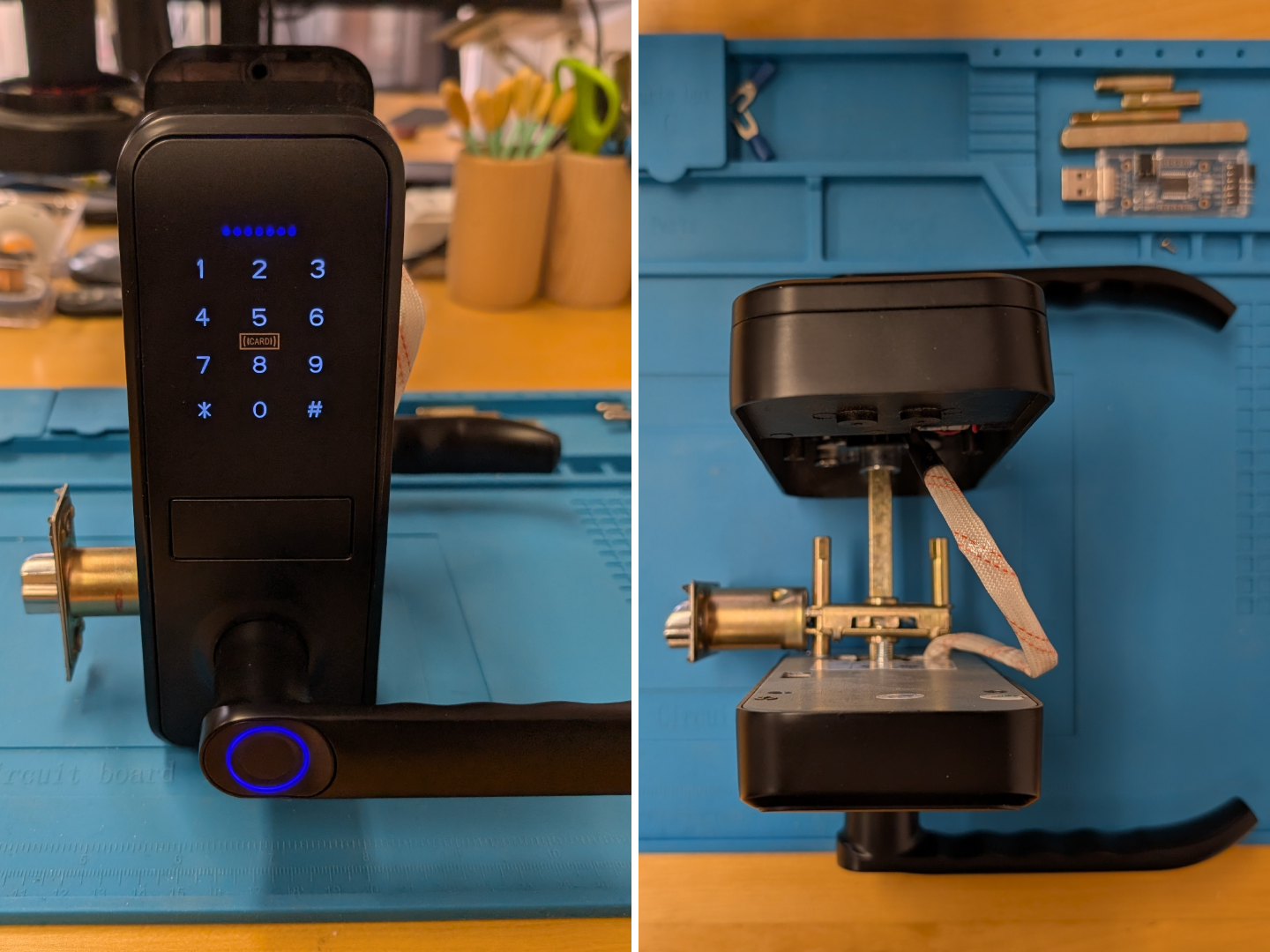 The target is a fairly typical Tuya-based smart lock: it pairs with the official Tuya mobile app over Bluetooth and supports multiple unlock methods, including permanent and temporary PINs, fingerprint recognition, and NFC tags that ship in the box. Straightforward to set up, pleasant enough to use day to day, and sitting on a desk in our office waiting to be taken apart.