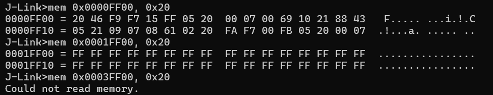 With the base address confirmed, the next step was inferring the flash size. Taking the most common embedded flash sizes as reference points: 64KB, 128KB, and 256KB, I read 32 bytes near the upper boundary of each candidate range, specifically at 0x0000FF00, 0x0001FF00, and 0x0003FF00.