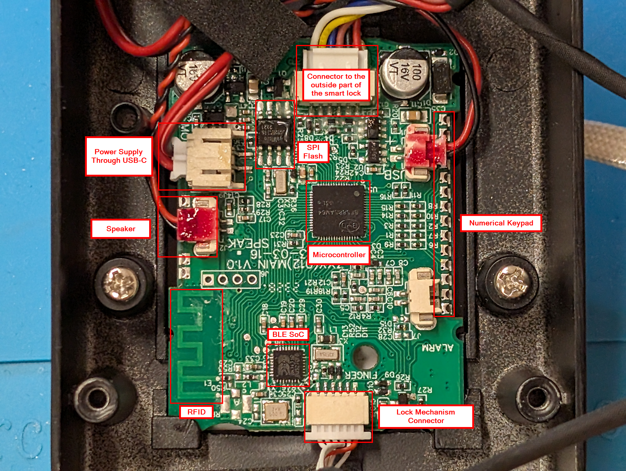 In this analysis I focus on a specific slice of the attack surface: PCB and hardware inspection, debug interface analysis, firmware reverse engineering and dynamic debugging with GDB. Other surfaces were identified during the analysis (e.g. serial commands likely issued by the BLE SoC to interact directly with the lock mechanism) but are left out of scope in favor of going deeper on the firmware path and building a concrete lab exercise.