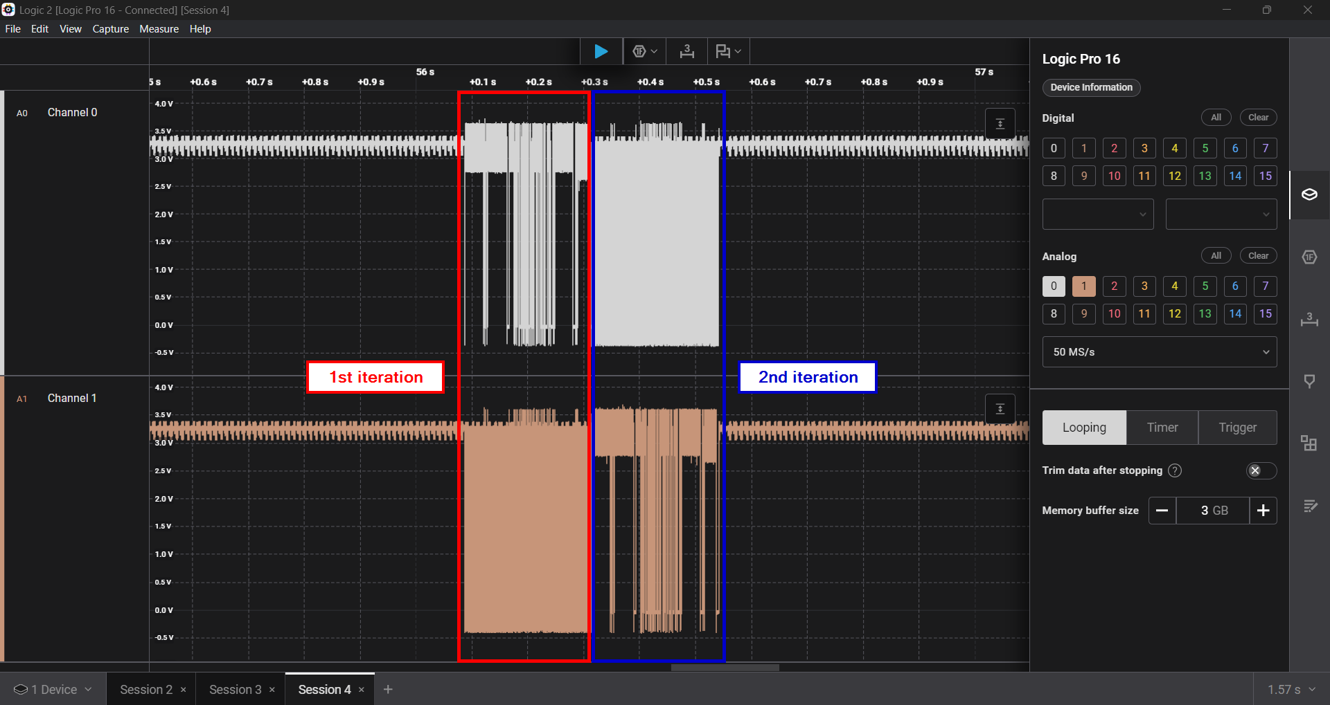 As you can see from the capture, both channels sit at around 3.3V at idle and the two possible pin combinations are clearly being tested in sequence. The setup is working as expected, so we are ready to move to the actual target.