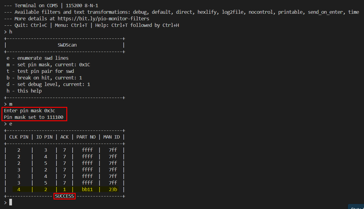 Running SWDscan with a pin mask of 0x3C (enabling Arduino pins 2 through 5), the tool finds the correct SWDCLK and SWDIO pinout after just 7 iterations.