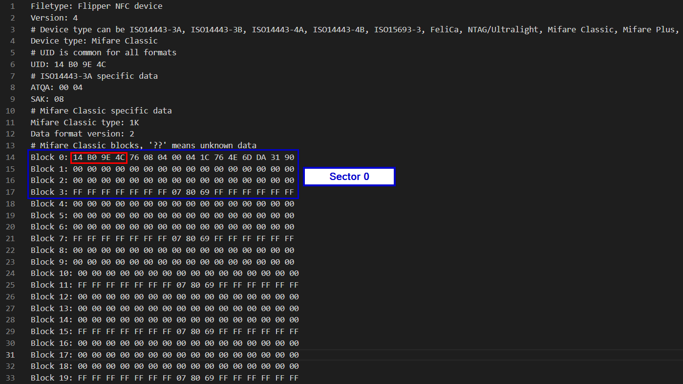 Taking Sector 0 as a reference, Block 0 is the Manufacturer Block and contains the card metadata: