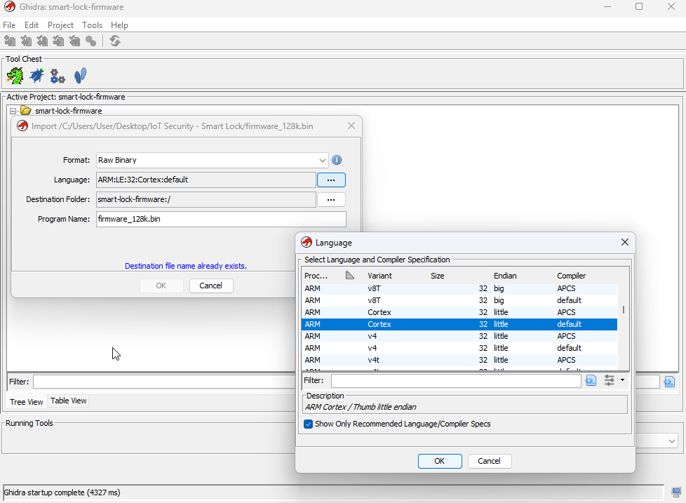 With the firmware extracted via SWD, the next step is loading it into Ghidra. The target MCU is an ARM Cortex-M0 running in little-endian mode, so I selected the corresponding processor definition at import time.
