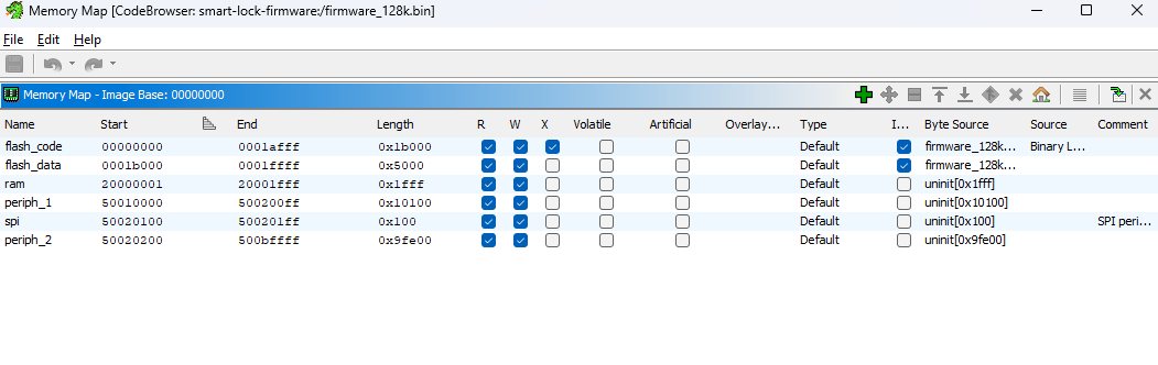 Ghidra memory map with an initial rough approximation of manually defined regions