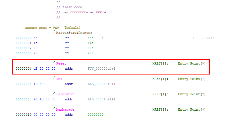 On Cortex-M0, the interrupt vector table lives at the very beginning of flash. The first word is the initial stack pointer, and the second word is the reset handler address, the actual entry point of the firmware.