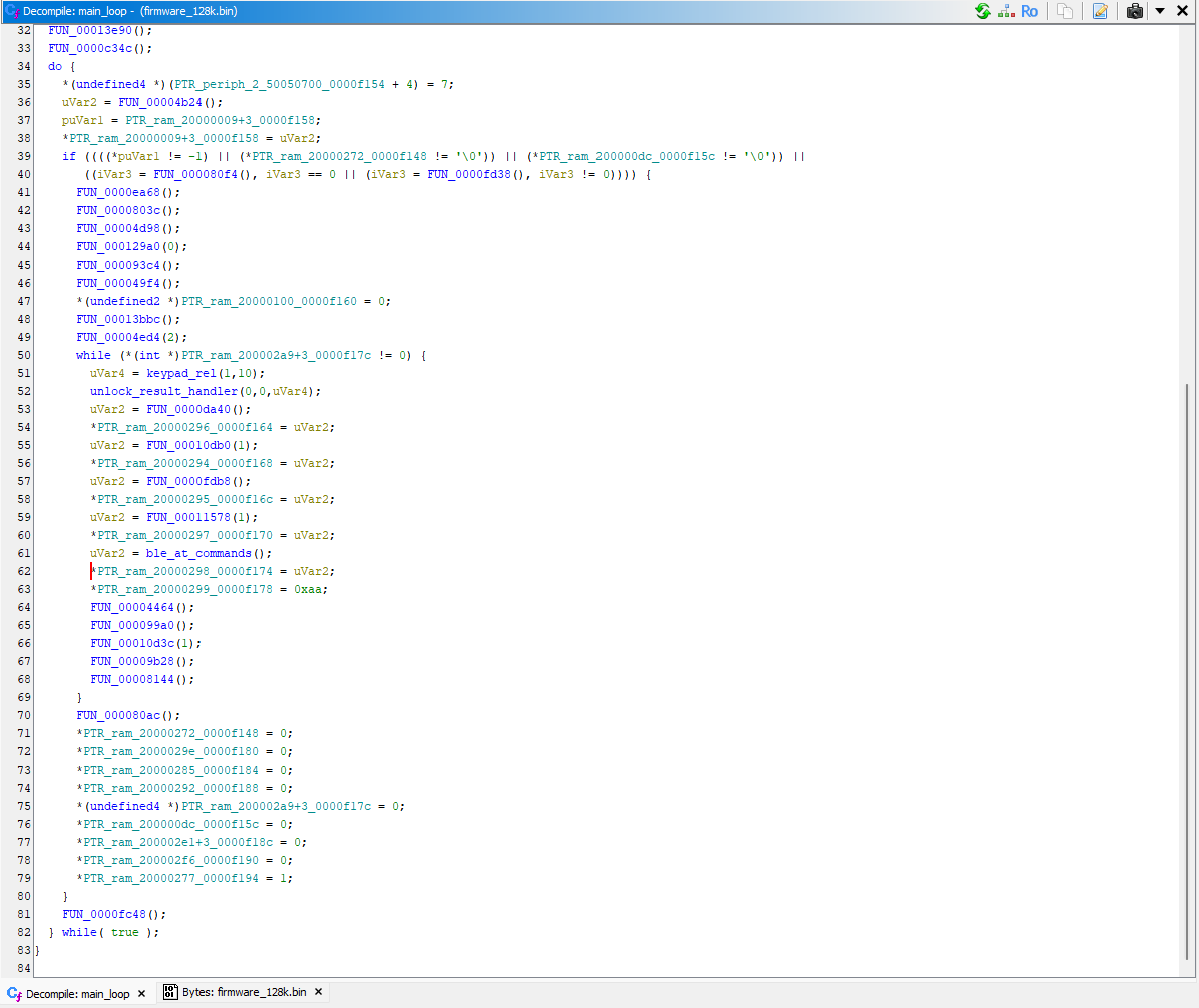 Following that address I landed in a series of function calls that looked like an initialization sequence, which eventually brought me to a function containing numerous nested calls and an infinite loop structure, the classic shape of an embedded main loop from which I continued the analysis.