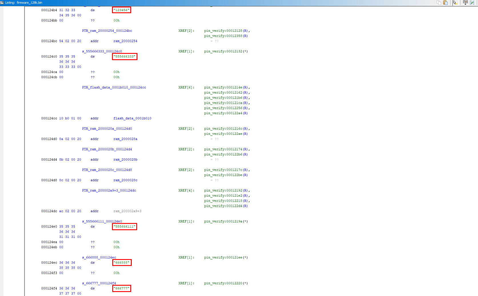 Rather than tracing every call path from the top, a faster way to reach the interesting logic is to search for meaningful strings embedded in the firmware. Browsing the string list, a cluster of numeric sequences stood out, grouped together in the same flash memory address range: "123456", "555666333", "555666111", "666888", "666777", "88991".