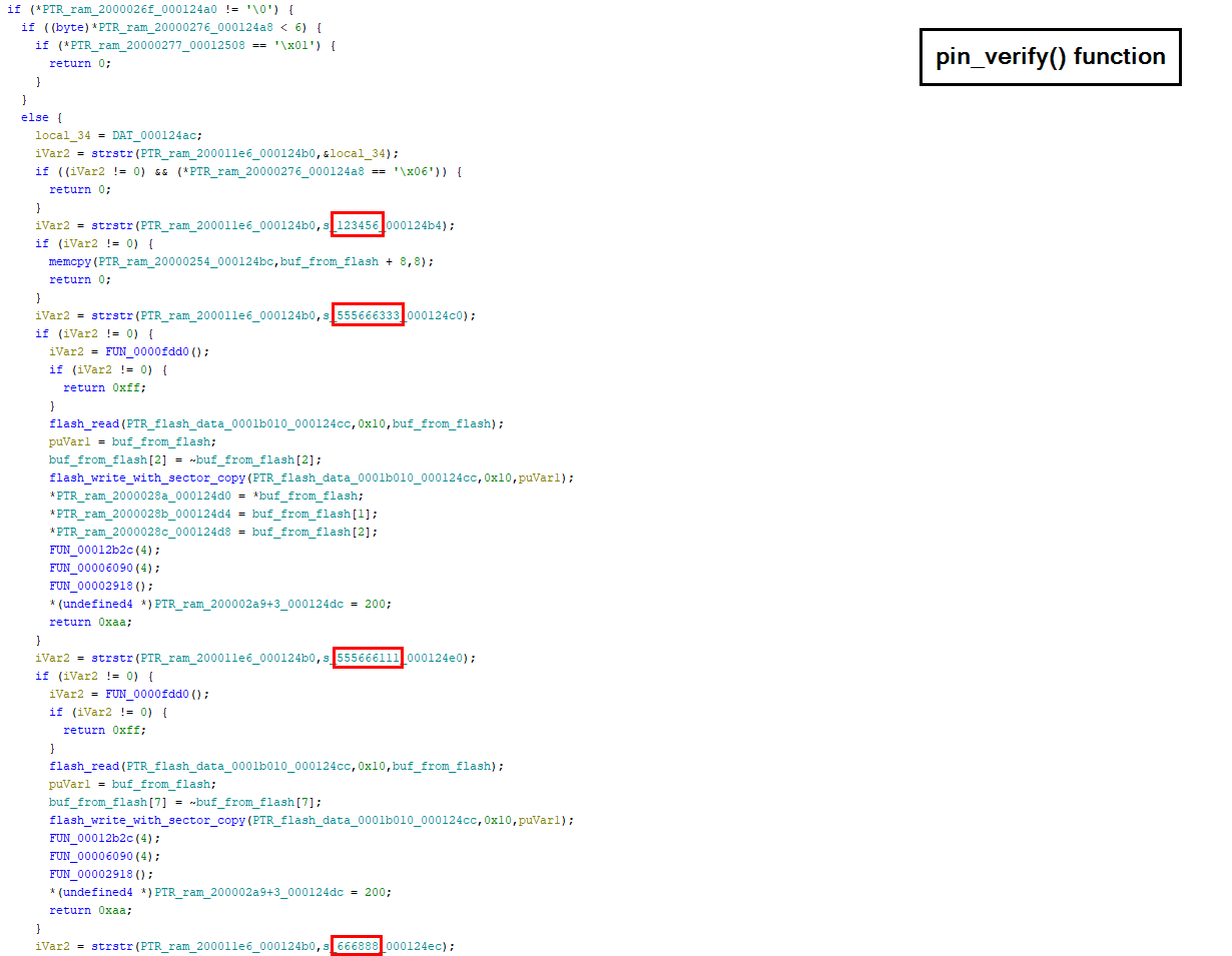 Further investigating pin_verify(), I found a function later renamed flash_write_with_hardcoded_addr that writes data to a range of addresses based at 0x1B000, an address we are already familiar with. Even though I could not use it directly because it hardcodes that base address, it contained all the building blocks needed to patch the firmware.