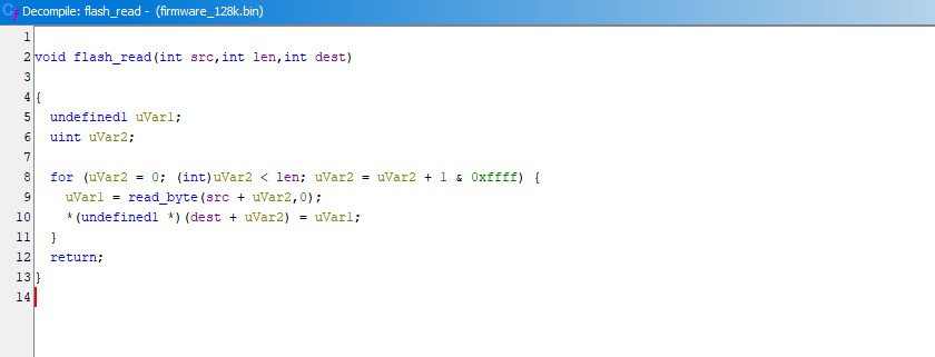flash_erase(addr)erases 512 bytes starting from theaddrpassed as argument. Since the function takes no length parameter, the erase size is implicitly fixed combined with the function analysis above, I’m assuming with good confidence that the sector size is 512 bytes.