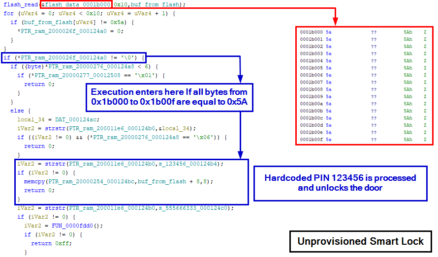 Given our initial observations this means: read bytes from 0x1B000 to 0x1B00F. If they are all 0x5A the device is unprovisioned and hardcoded PINs are taken into account, otherwise they are skipped entirely.