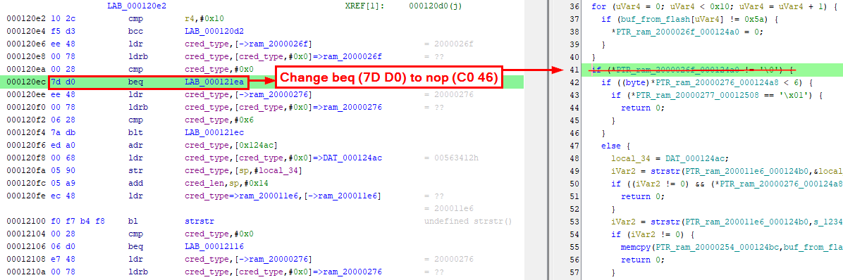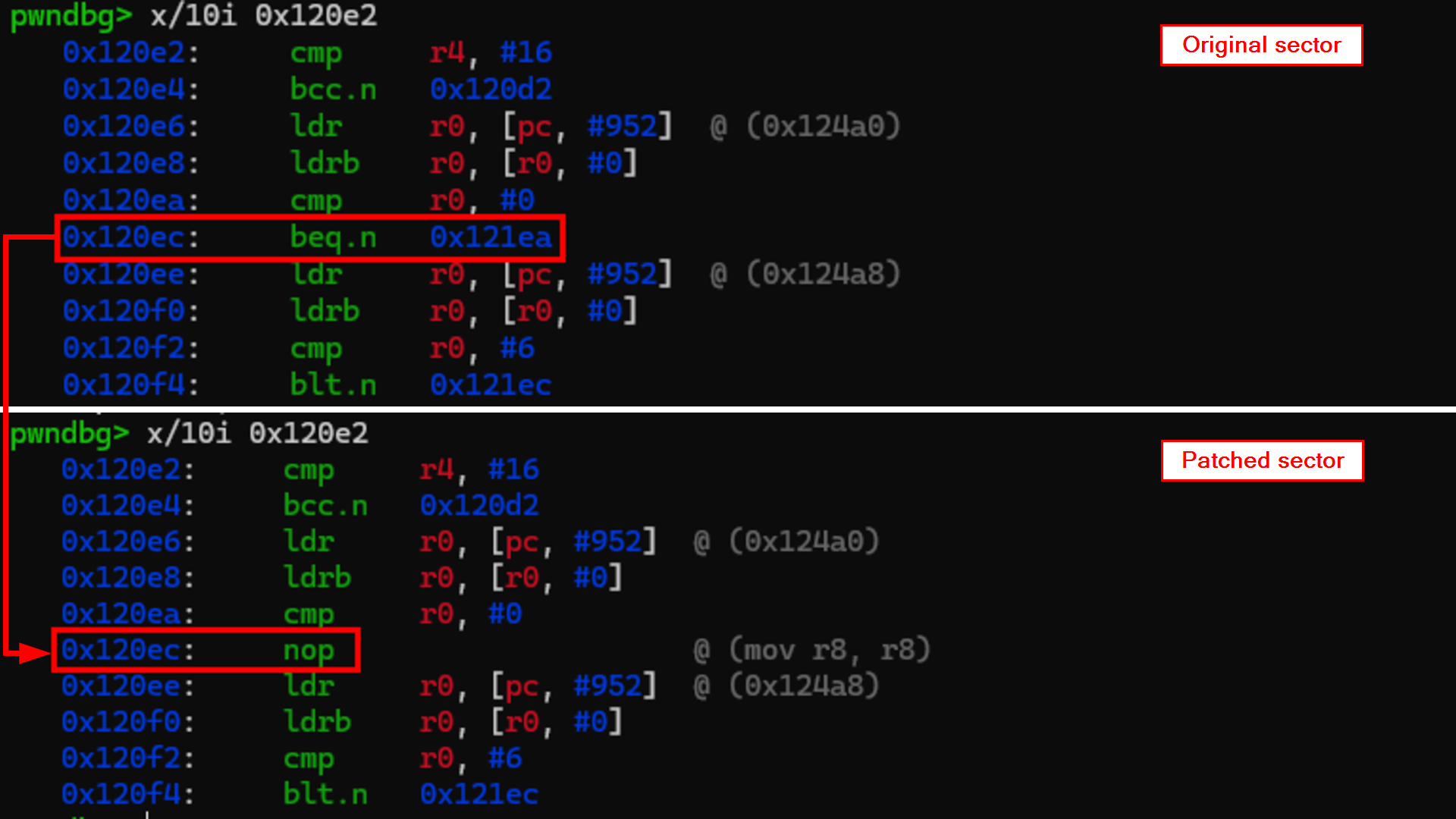 The first and main patch targets the provisioning check itself. As shown in the previous section, a beq instruction controls whether execution enters the hardcoded PIN block based on the 0x5A marker check. Converting that beq to a NOP forces execution to always fall into that block.