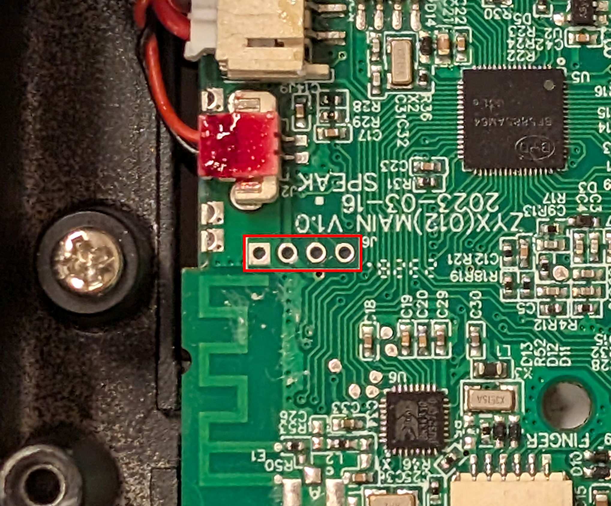 The most obvious candidate for an SWD interface was a group of four exposed pins on the left side of the board. SWD requires four signals: VCC, GND, SWDIO, and SWDCLK. With VCC and GND straightforward to identify through basic continuity checks, only two pin combinations remained to try for the data and clock lines.