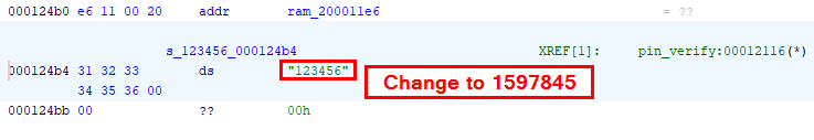 With these three patches in place the hardcoded PIN 123456 always unlocks the door regardless of provisioning state, surviving any factory reset. However 123456 is easily guessable, so the final patch replaces that string in flash with a custom less obvious value. For this exercise the backdoor PIN will be 1597845.