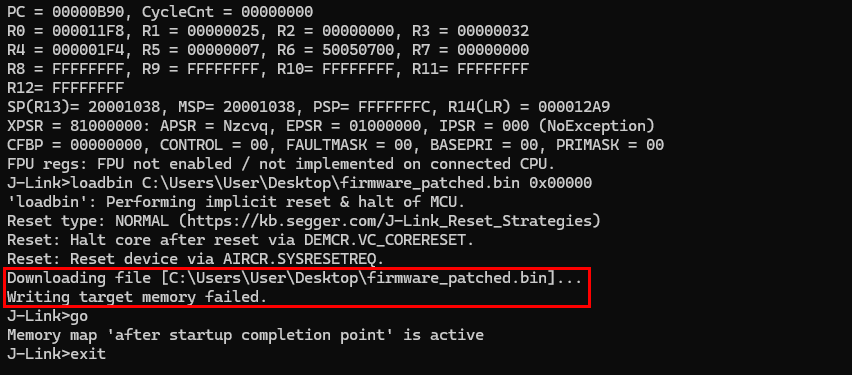 Once I identified the bytes to change and saved the patched binary as firmware_patched.bin, the first attempt was simply rewriting the entire firmware onto the MCU internal flash using JLink. That immediately failed.