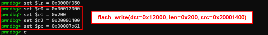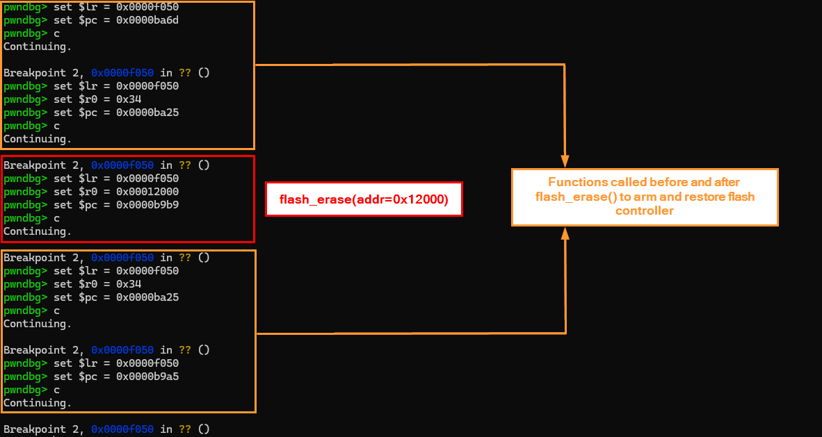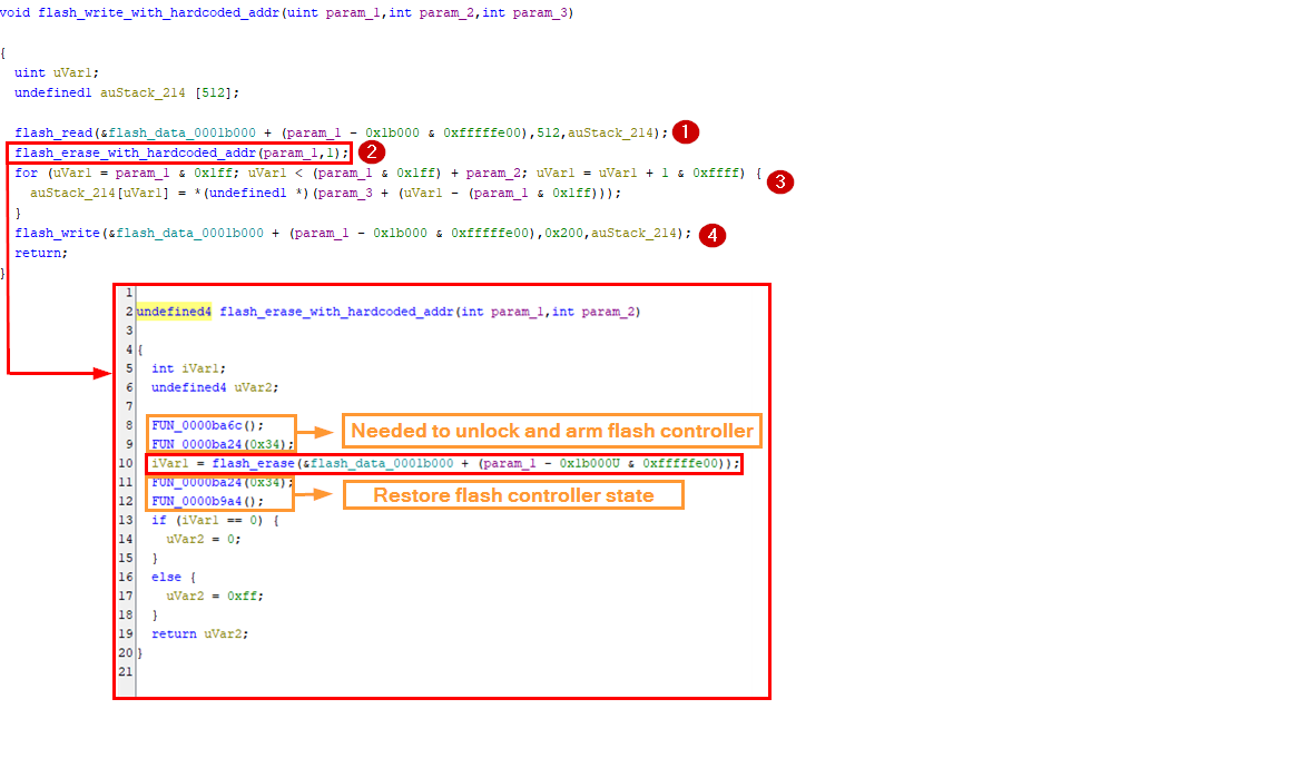 One important detail emerged during dynamic debugging: calling flash_erase() alone had no effect. Looking at the flash_erase_with_hardcoded_addr wrapper, two additional calls wrap the erase on both sides, labeled in orange in the screenshot above. Replicating that exact sequence confirmed they are required to unlock and arm the flash controller before the erase can take place, and to restore its state afterward.