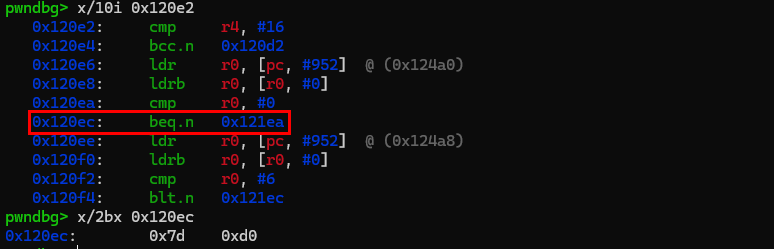 Let’s now walk through the actual GDB commands for patching the beq instruction at 0x120ec.
