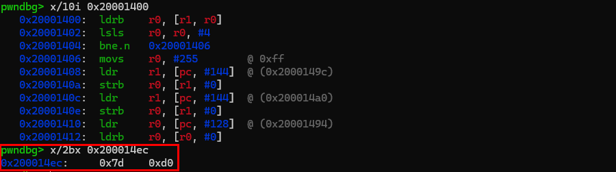 The beq opcode (7D D0) is present at offset 0xEC within the RAM buffer (0x200014ec)