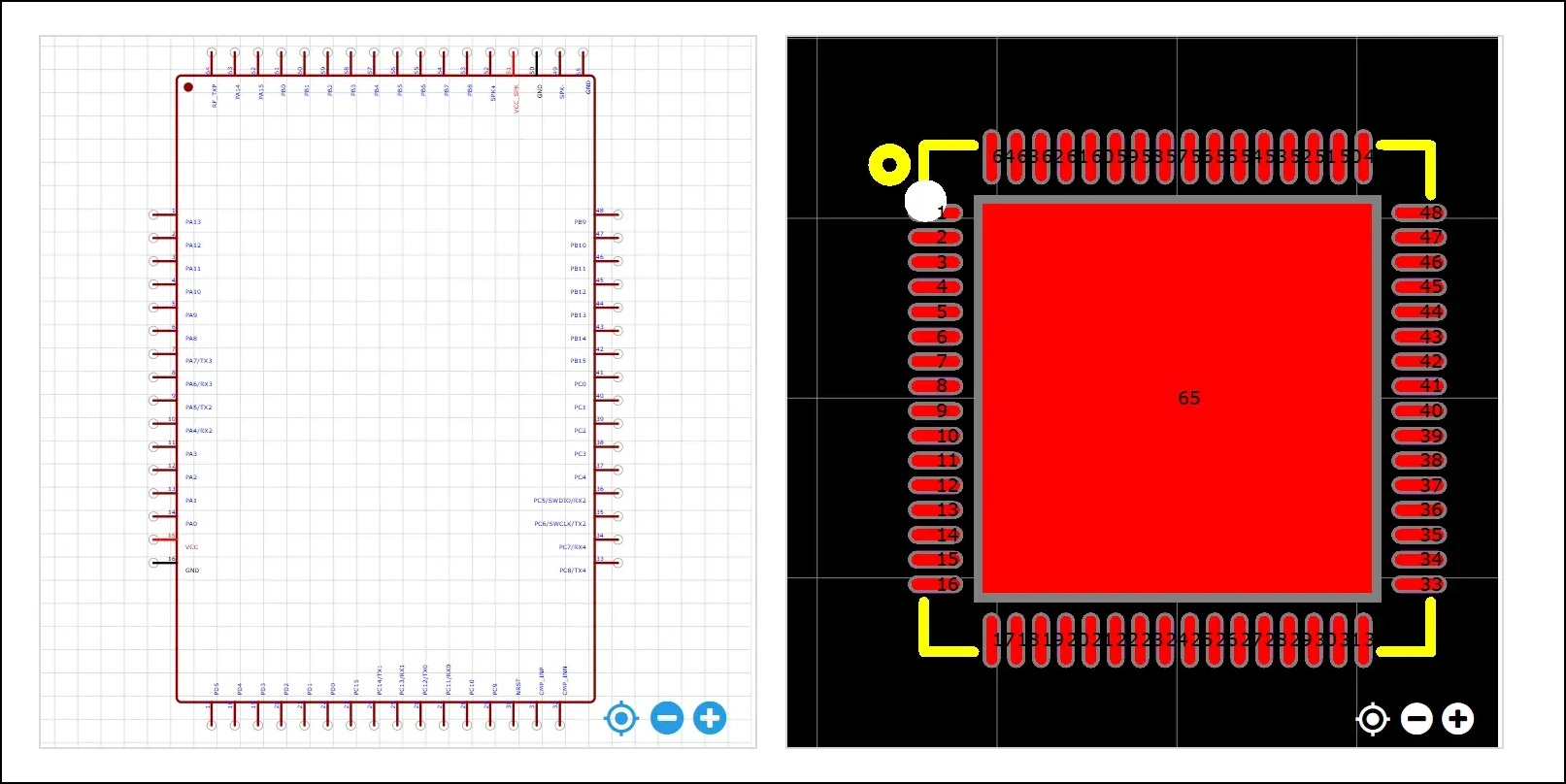With the NRST pin confirmed, we can now focus on locating the SWD pins. With the PCB map in mind, we can start ruling out pins that clearly route to known components and concentrate on the ones connected to vias that terminate on pads with no obvious role, isolated or unassigned at first glance, like the ones highlighted below as an example.