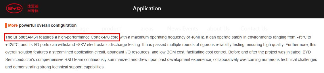 Further useful information about the microcontroller was found directly on the official BYD website: the BF5885AM64 integrates an ARM Cortex-M0 core.