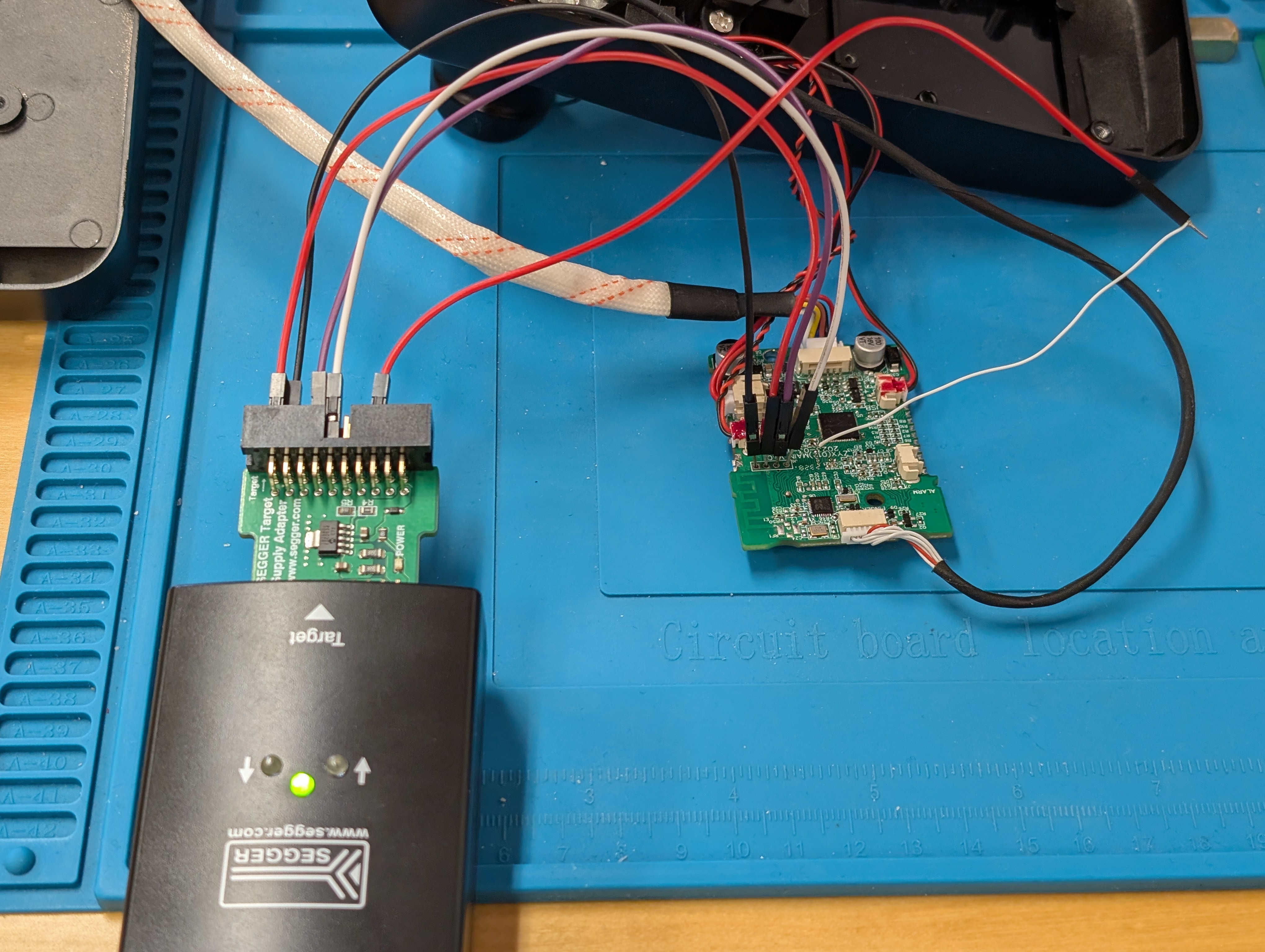 With the schema in hand, a quick continuity check with a multimeter confirmed that the four pins found earlier did indeed map to the SWD interface, most likely muxed with I2C during normal device operation, which explained the signals observed earlier.