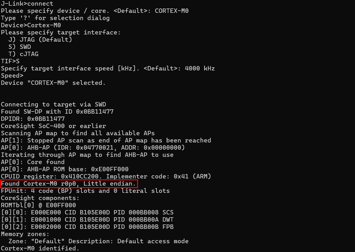 The JLink output confirmed “Found Cortex-M0 r0p0, Little endian”, verifying the core architecture on the spot.
