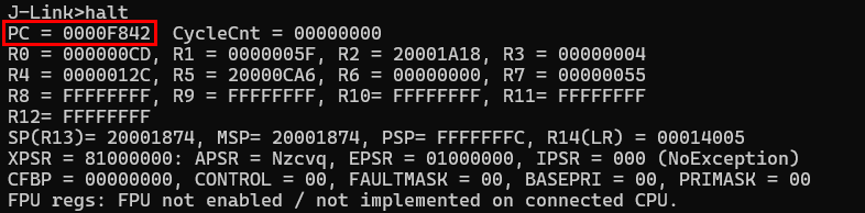 CPU halted: PC at 0x0000F842, confirming firmware is mapped from 0x00000000