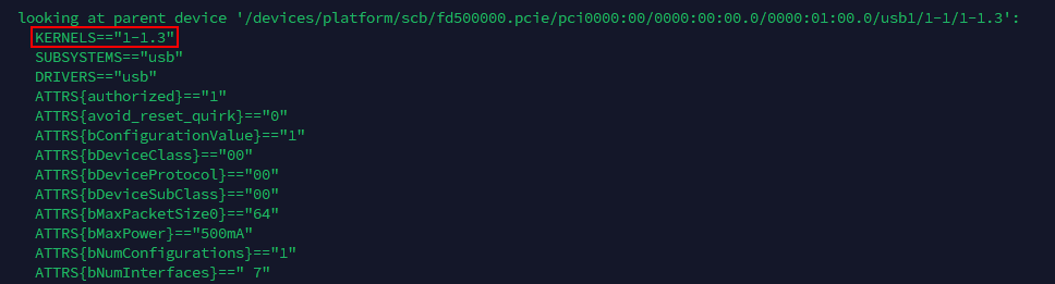 The output was examined to identify the KERNELS=="…" entry representing the base USB path.