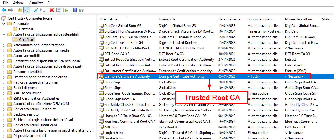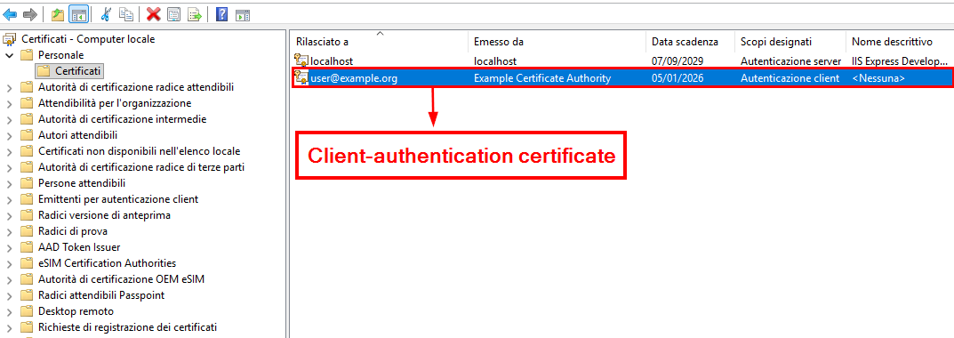 On the Windows laptop (supplicant), the issuing CA certificate is trusted, and a client-authentication certificate (including the private key) is installed in the certificate store. Windows is then configured to use that certificate for 802.1X authentication on the Ethernet interface.