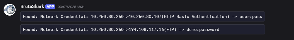 The Python wrapper parses the output in real time, deduplicates new “Credential” findings, logs them under the service’s log folder, and sends notifications to a private Discord channel (the same used by the bot described in Part 1, Chapter 3) via webhook, so operators see fresh credentials without polling the device.