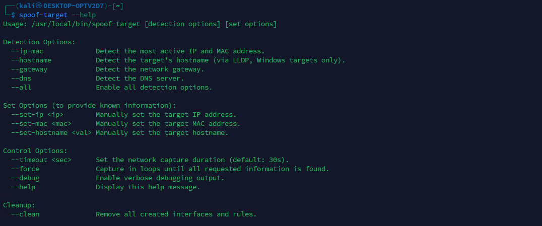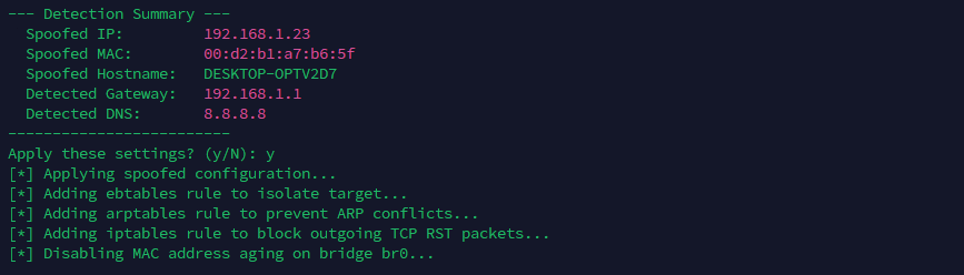 For cleanup, the --clean option removes all spoofing-related configuration and restores the initial state. The bridge-sync systemd timer also performs this automatically when the bridge is destroyed.