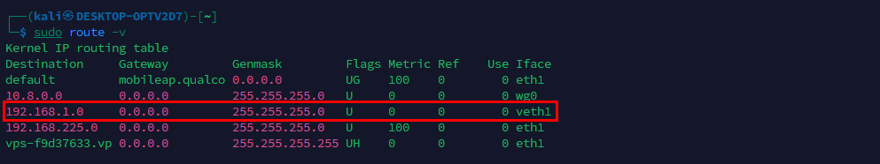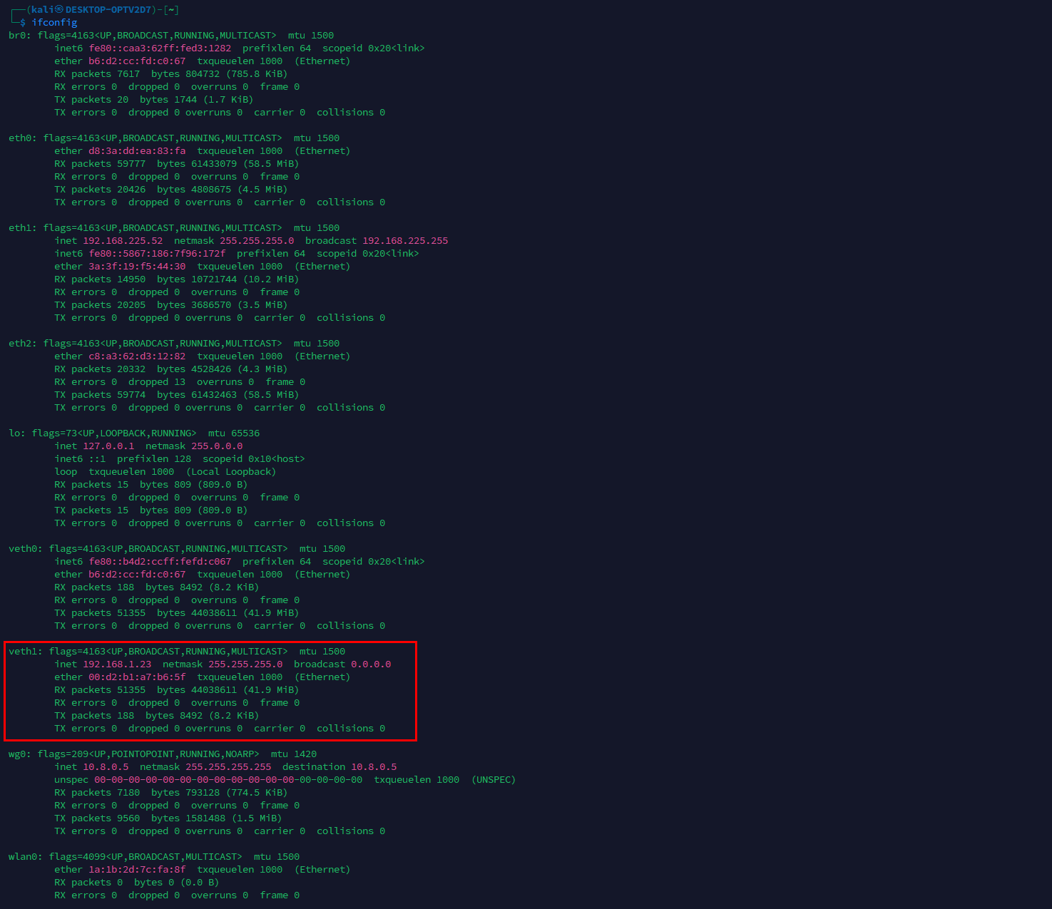 Once configuration is applied, the network state appears as below. From this state, the implant can reach the internal network via veth1 using the spoofed identity, whether 802.1X is present or not.