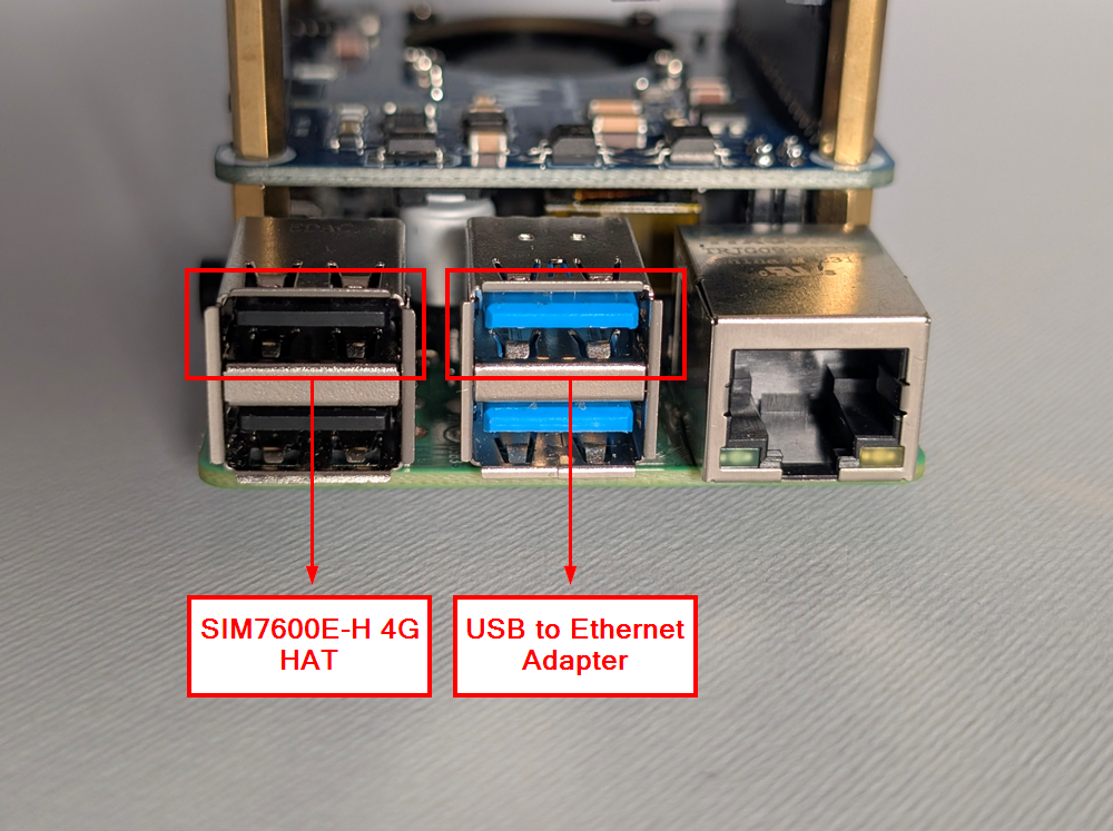 Because the mapping is bound to USB port paths, wiring must follow the assigned ports: the SIM7600G-H modem and the USB-to-Ethernet adapter must be connected to the Raspberry Pi ports shown in the figure, corresponding to USB paths 1–1.3 and 2–1 identified earlier.