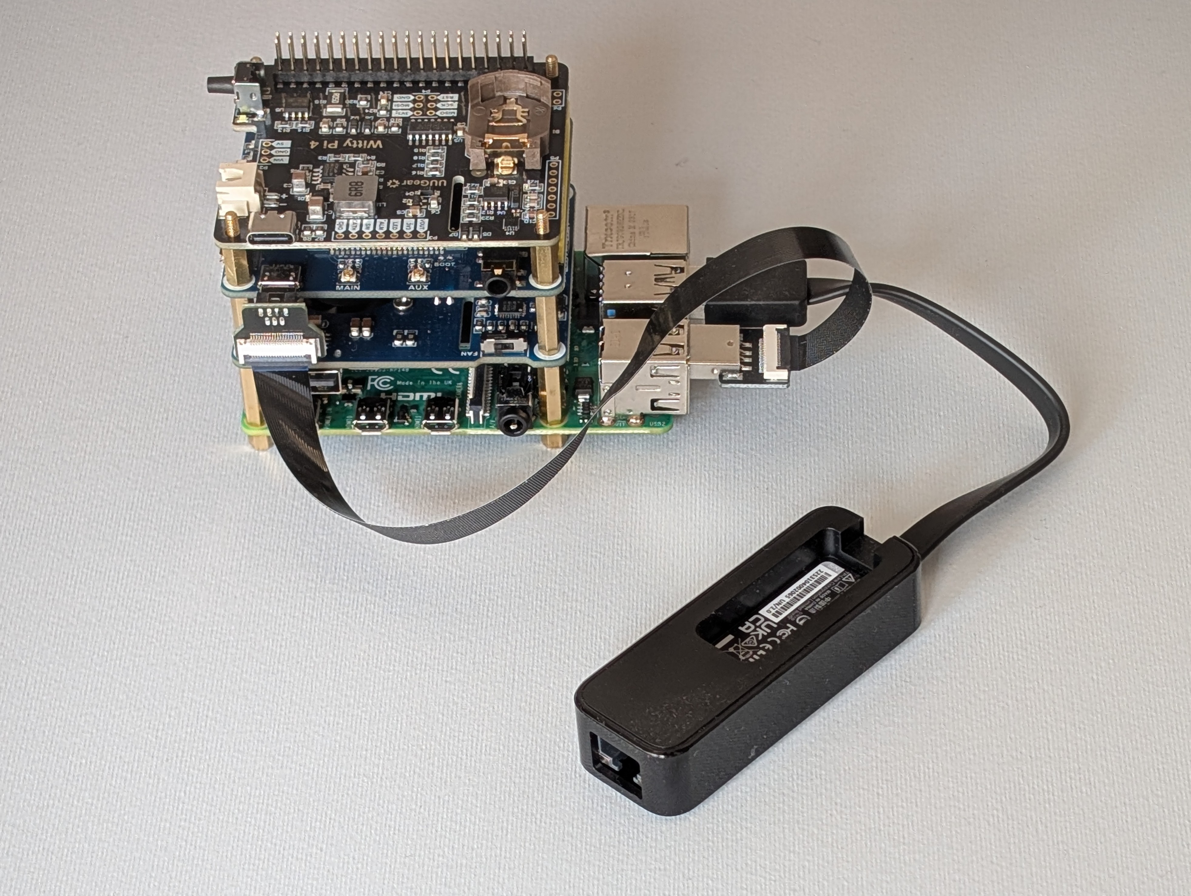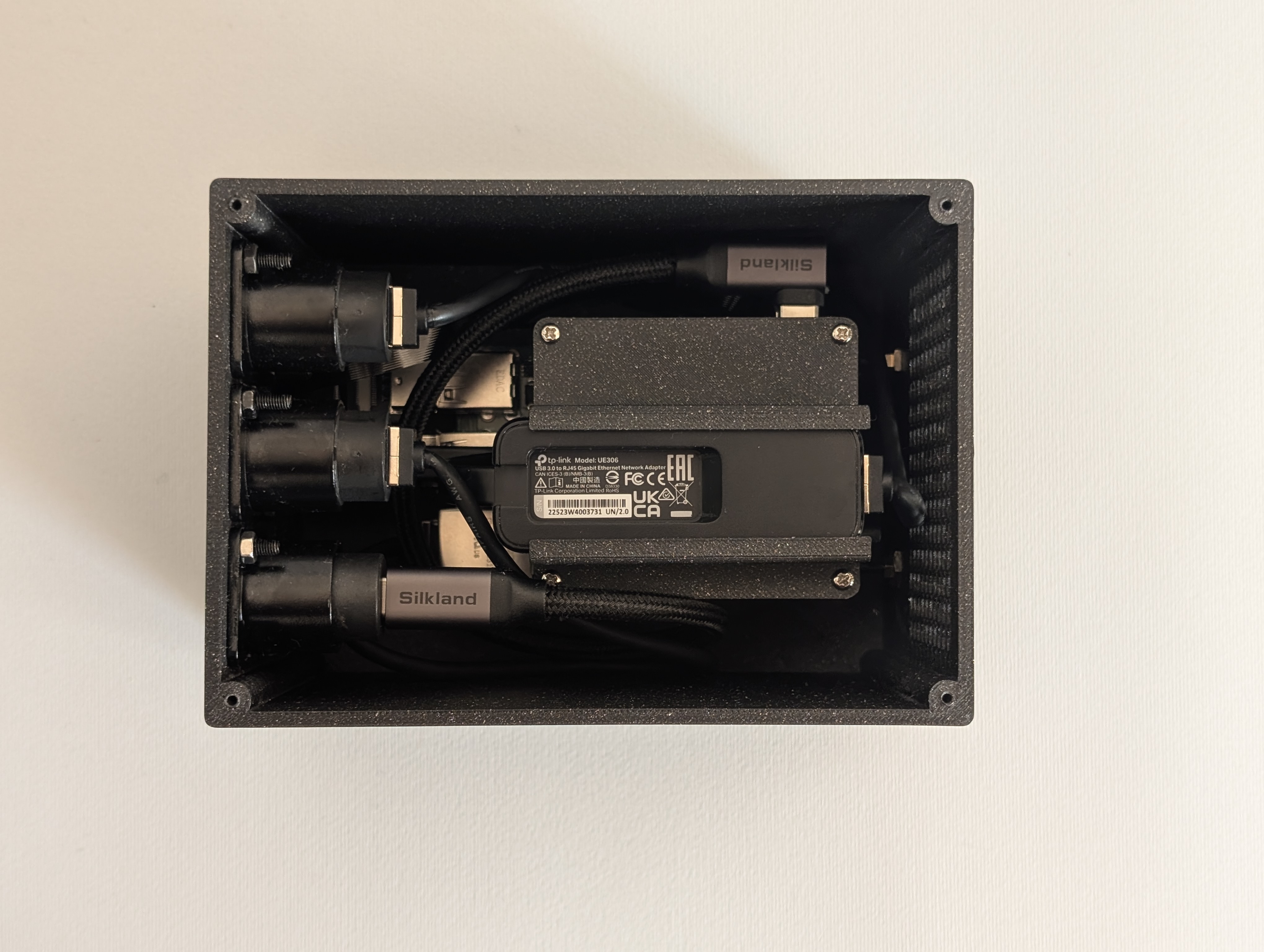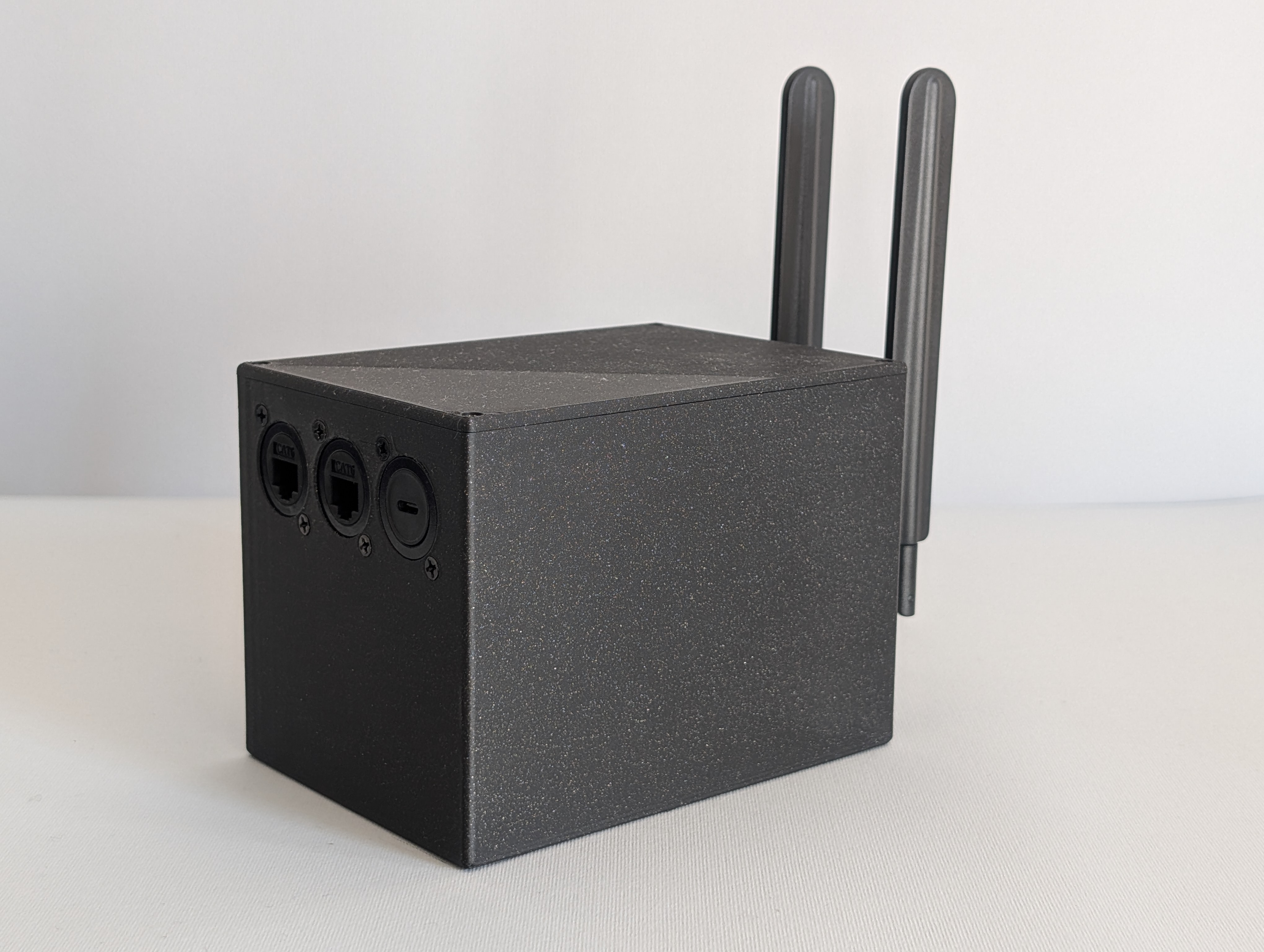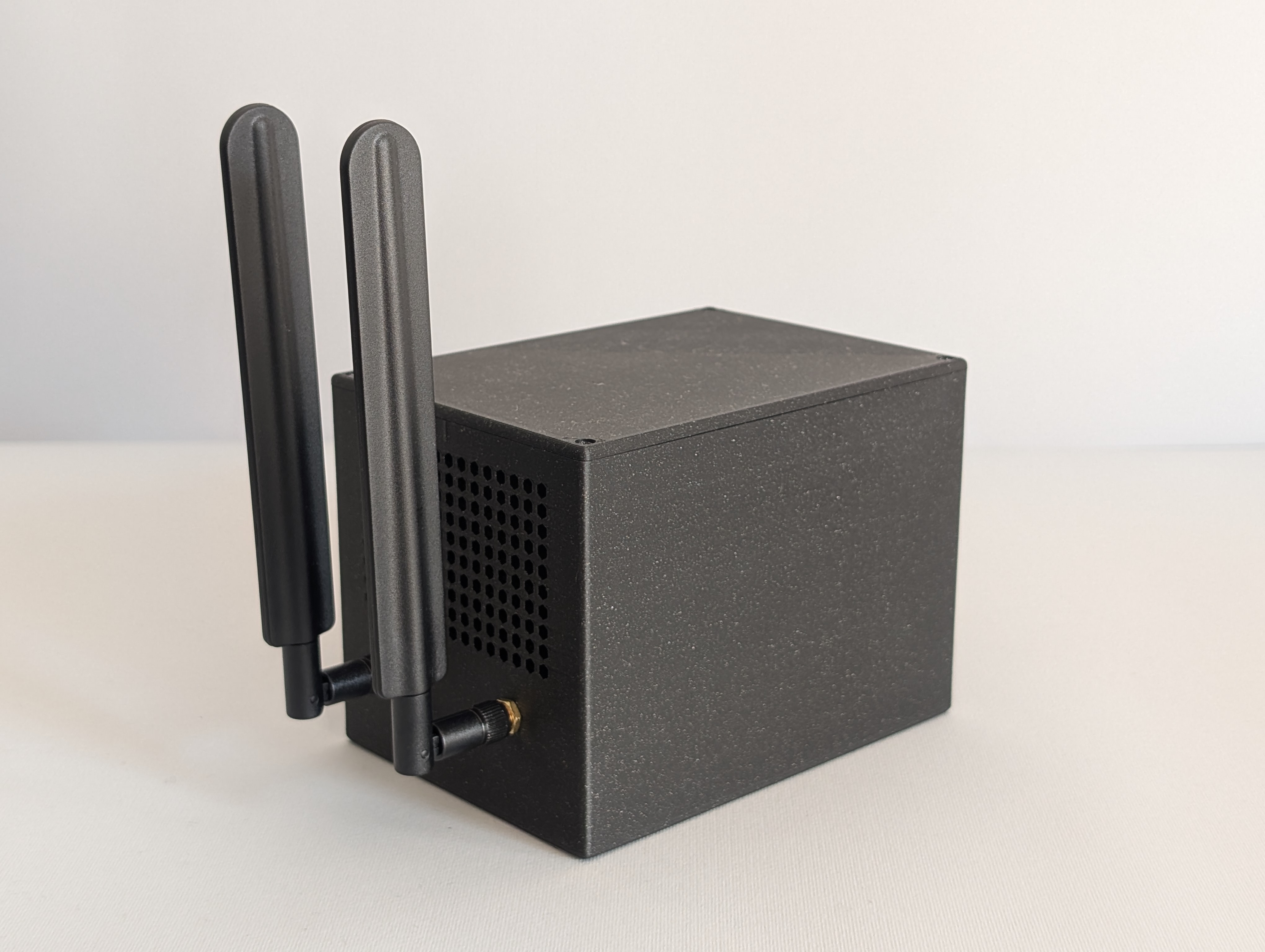 With the enclosure printed, the full stack was assembled inside the case and all connections were routed: two Ethernet leads, one USB-C power feed, and two RP-SMA pigtails for the antennas.