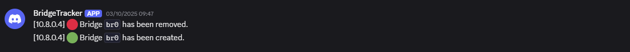 Operational feedback is written to a dedicated log (/opt/implant/logs/bridgesync/bridge-sync.log), and, when enabled in /opt/implant/config.env, each bridge creation or deletion triggers a message to the implant’s control Discord server (the same used by the bot introduced in the previous chapter). This makes the physical state immediately observable, for example detecting when a laptop is connected or disconnected behind a docking station based on “bridge created” or “bridge removed” notifications.