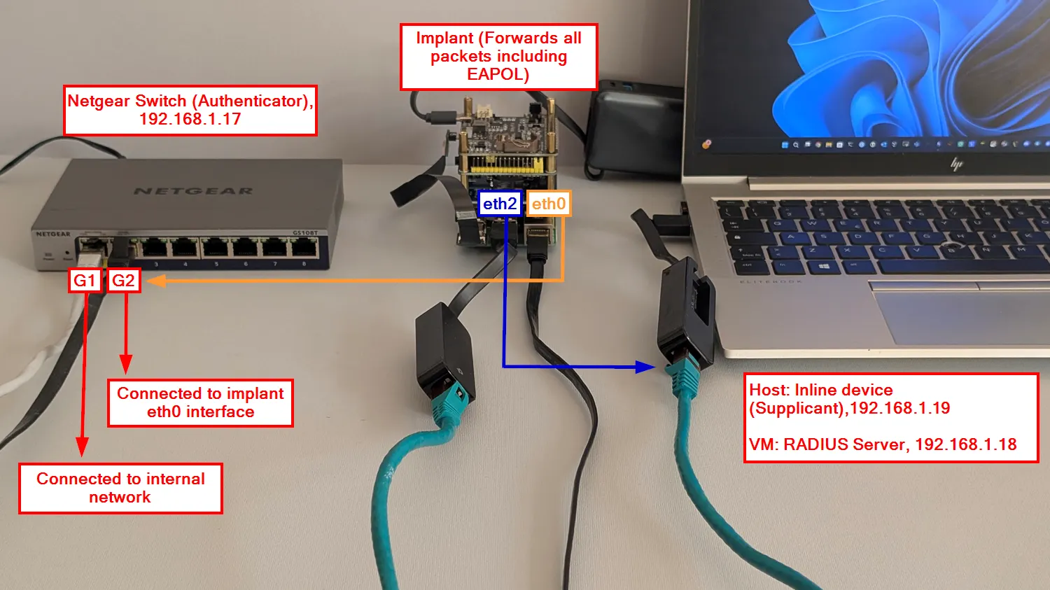 In theory, with this bridge configuration, 802.1X packets pass through, allowing NAC-enforced devices to operate normally even with the implant inline. To verify this behavior, a minimal lab was created to replicate the scenario. The actors and their 802.1X roles are listed below.