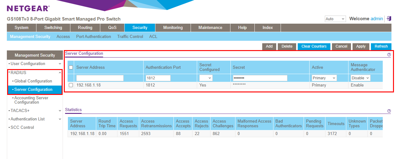 The configuration of each component in this setup is straightforward. On the Netgear switch, the RADIUS server used for 802.1X was added from the web GUI, as shown below.