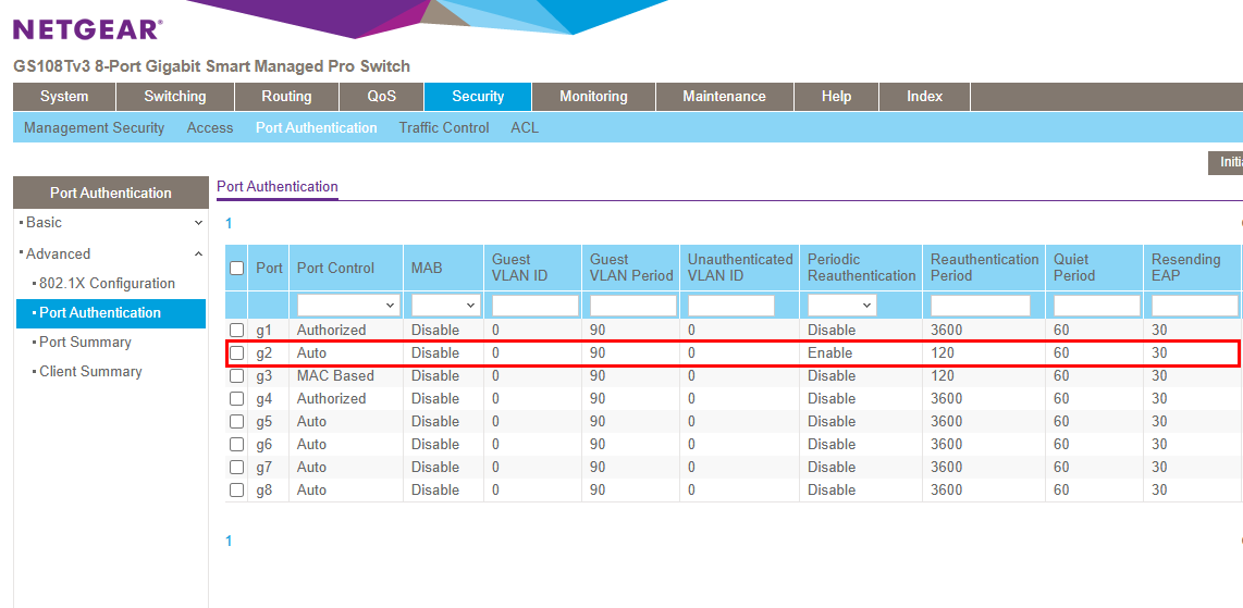 On port g2, 802.1X port authentication was enabled. Periodic Reauthentication is set to Enable, with a Reauthentication Period of 120 seconds, so the supplicant reauthenticates every two minutes.