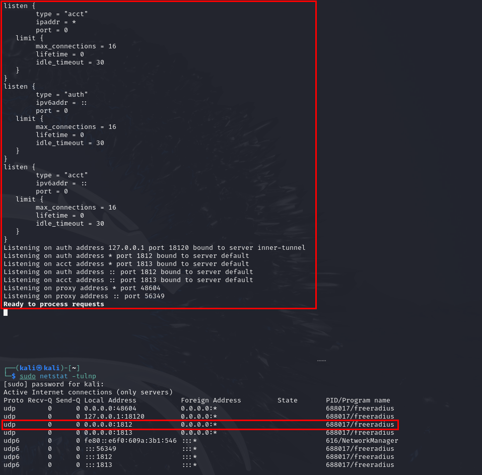 After configuration, FreeRADIUS is started with sudo freeradius -X. It then listens for authentication on UDP port 1812.